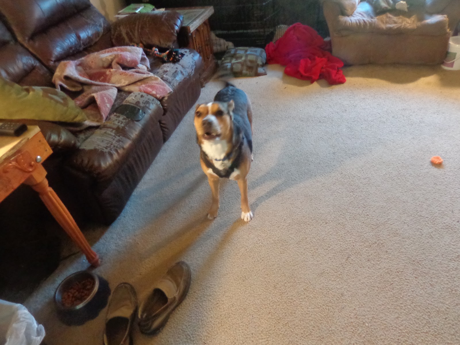 | So much nicer to walk with her after she's been worn down by a rousing post-trash gathering game of "Put the doggie in the bag" |
