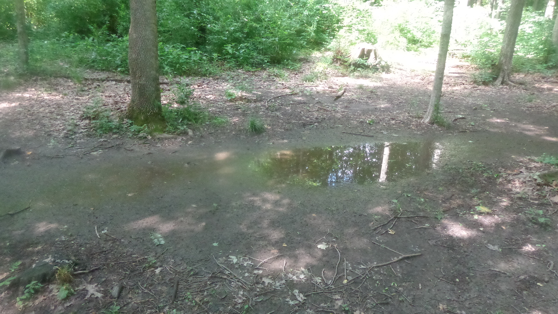 It poured, and I do mean poured. We hid under a tree for a while, accompanied by a mosquito who didn't survive the experience... but soon the trail became more of a river, and we made a break for it...